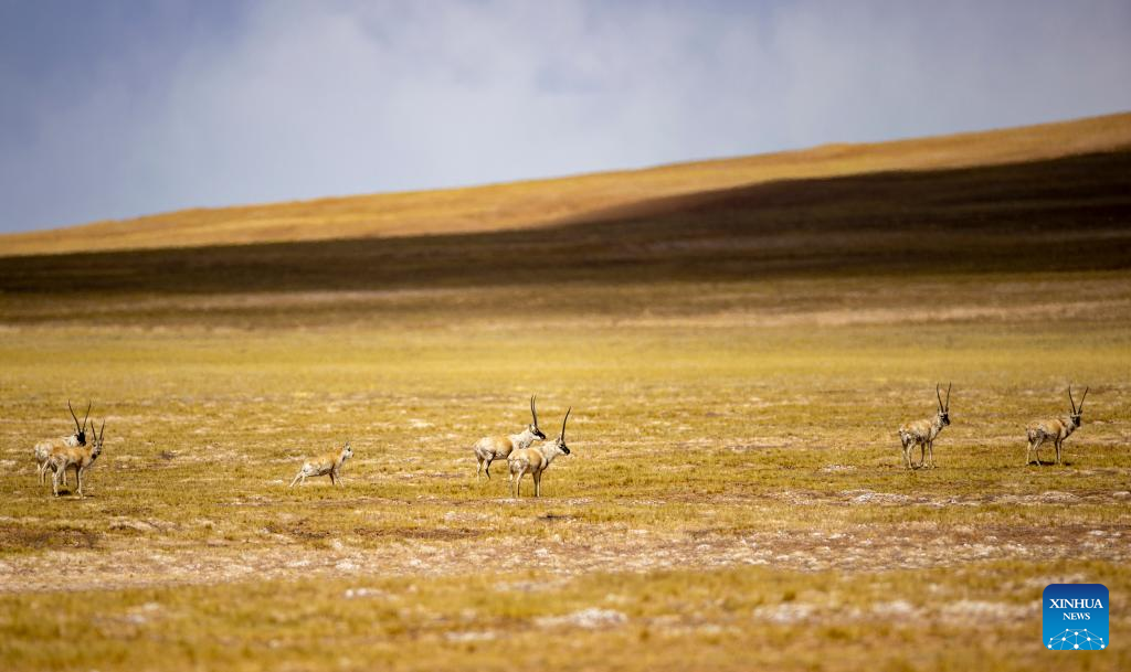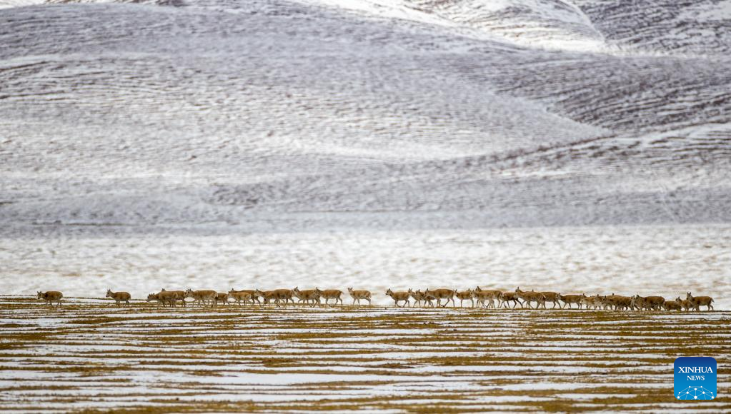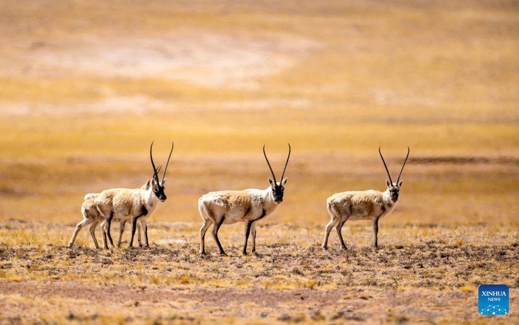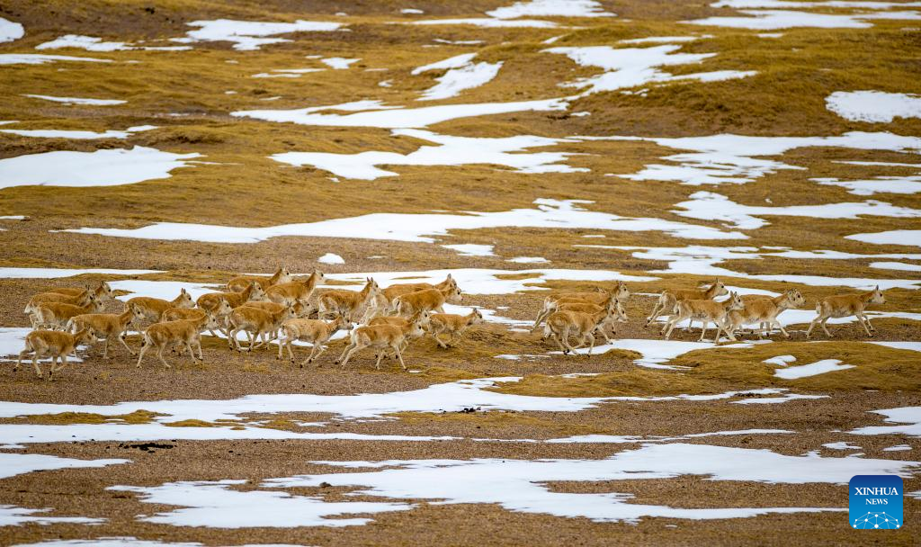 This photo taken on April 18, 2023 shows Tibetan antelopes at the Qiangtang National Nature Reserve in the northern part of southwest China's Tibet Autonomous Region. (Xinhua/Jiang Fan)