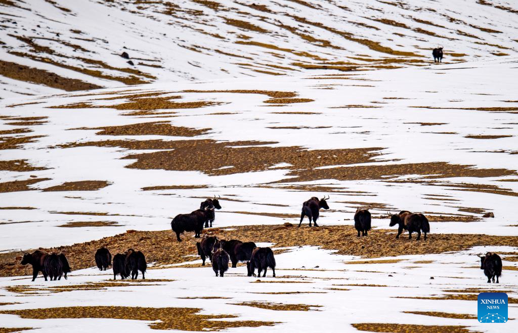 This photo taken on April 17, 2023 shows wild yaks at the Qiangtang National Nature Reserve in the northern part of southwest China's Tibet Autonomous Region.?(Xinhua/Jiang Fan)