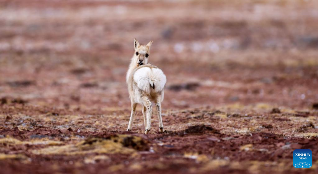 This photo taken on April 18, 2023 shows a Tibetan antelope at the Qiangtang National Nature Reserve in the northern part of southwest China's Tibet Autonomous Region.?(Xinhua/Jiang Fan)
