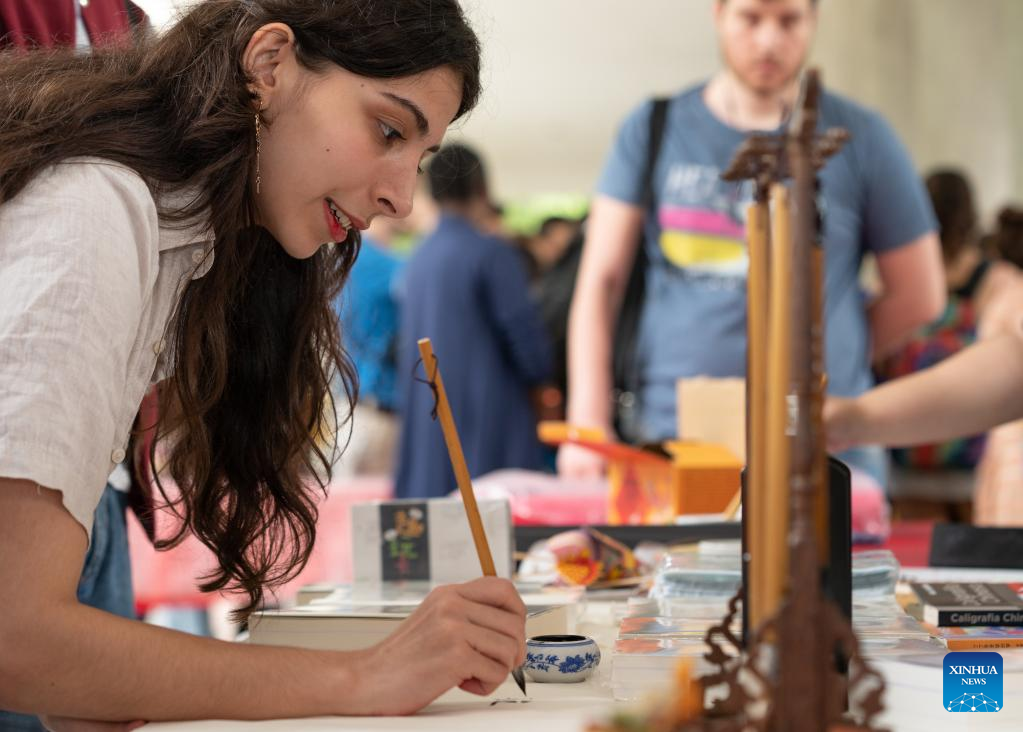 People write Chinese calligraphy during an event celebrating the upcoming UN Chinese Language Day in Rio de Janeiro, Brazil, on April 19, 2023. The UN Chinese Language Day is observed every year on or around April 20, when the contribution of Chinese literature, poetry, and language to world culture is highlighted. (Xinhua/Wang Tiancong)