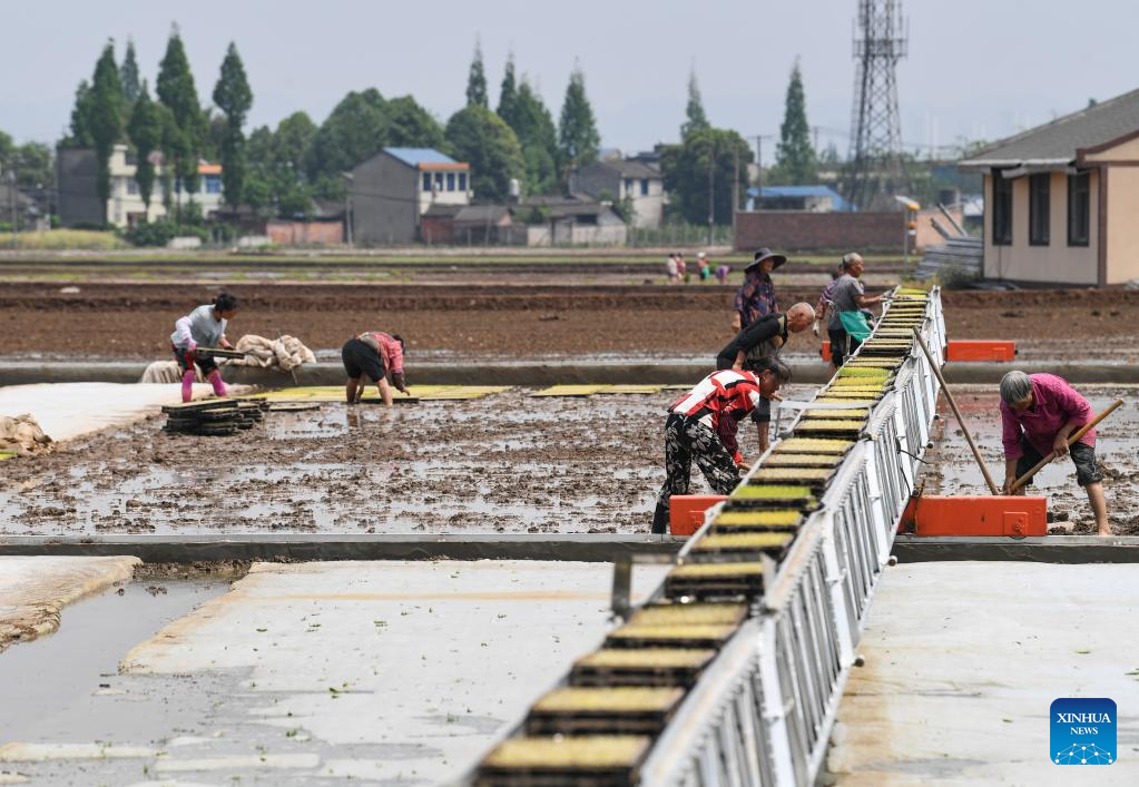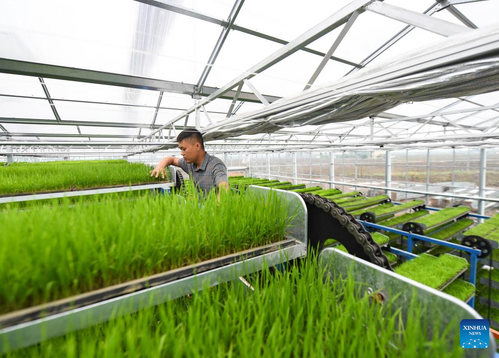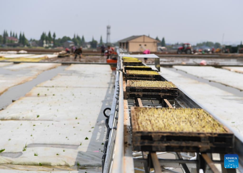 Rice seedling trays are transported on the conveyer belt at an intelligent rice farming demonstration base in Gongyi Town of Pengshan District in Meishan, southwest China's Sichuan Province, April 20, 2023. Pengshan District has taken efforts to speed up the construction of digital intelligent rice farming demonstration base. Intelligent machinery has been used in the process of raising and transplanting to improve the efficiency of rice farming. (Xinhua/Wang Xi)