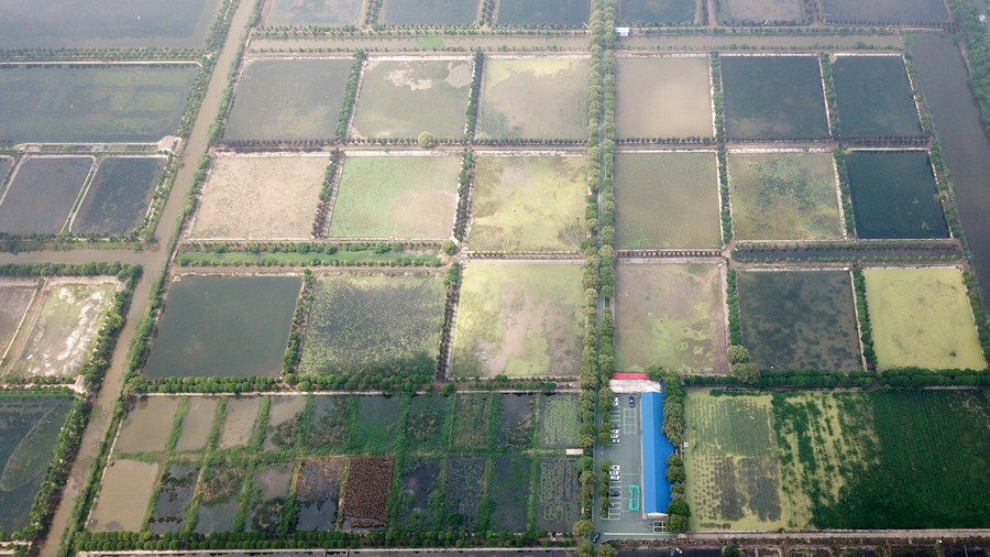 This aerial photo taken on April 20, 2023 shows a view of Datong Lake aquatic plants industrial demonstration park in Yiyang, central China's Hunan Province. (Xinhua/Chen Zhenhai)