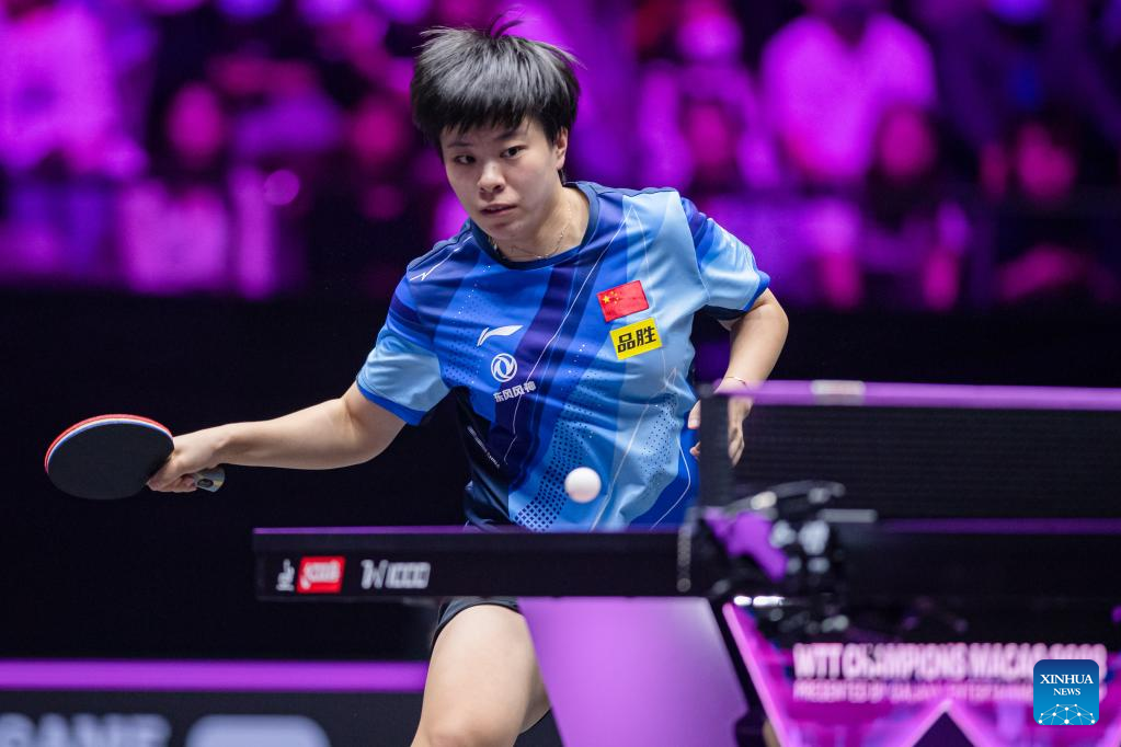 Wang Yidi of China hits a return during the women's singles semifinal match against her teammate Wang Manyu at the WTT Champions Macao 2023 in Macao, south China, April 22, 2023. (Xinhua/Cheong Kam Ka)