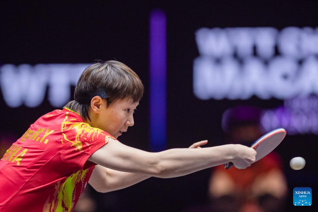 Wang Manyu of China hits a return during the women's singles semifinal match against her teammate Wang Yidi at the WTT Champions Macao 2023 in Macao, south China, April 22, 2023. (Xinhua/Cheong Kam Ka)