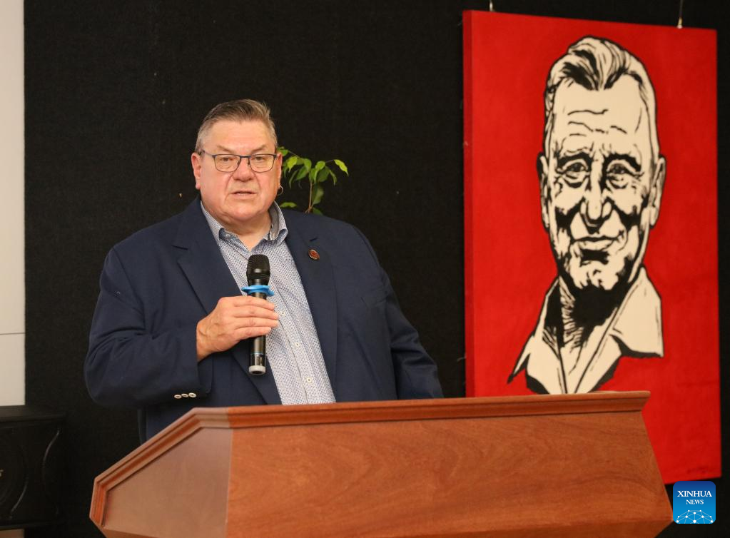 Chris Lipscombe, national president of the New Zealand China Friendship Society, speaks during the opening ceremony of an exhibition featuring artworks about Rewi Alley in Wellington, New Zealand, April 21, 2023. An exhibition featuring artworks about Rewi Alley, who opened the door for New Zealand-China diplomatic ties, and historical items and pictures that showcase his prominent contribution to China's revolution, development and bilateral friendship, kicked off here on Friday. (Photo by Meng Tao/Xinhua)