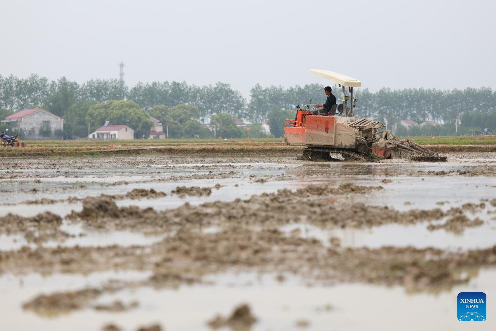 A farmer driving a machine works in a field in Zhongtang Village of Heshan District in Yiyang, central China's Hunan Province, on April 21, 2023. Agricultral machines such as rice transplanter, rotary tiller and drones have helped streamlining the spring ploughing here. (Xinhua/Xue Yuge)