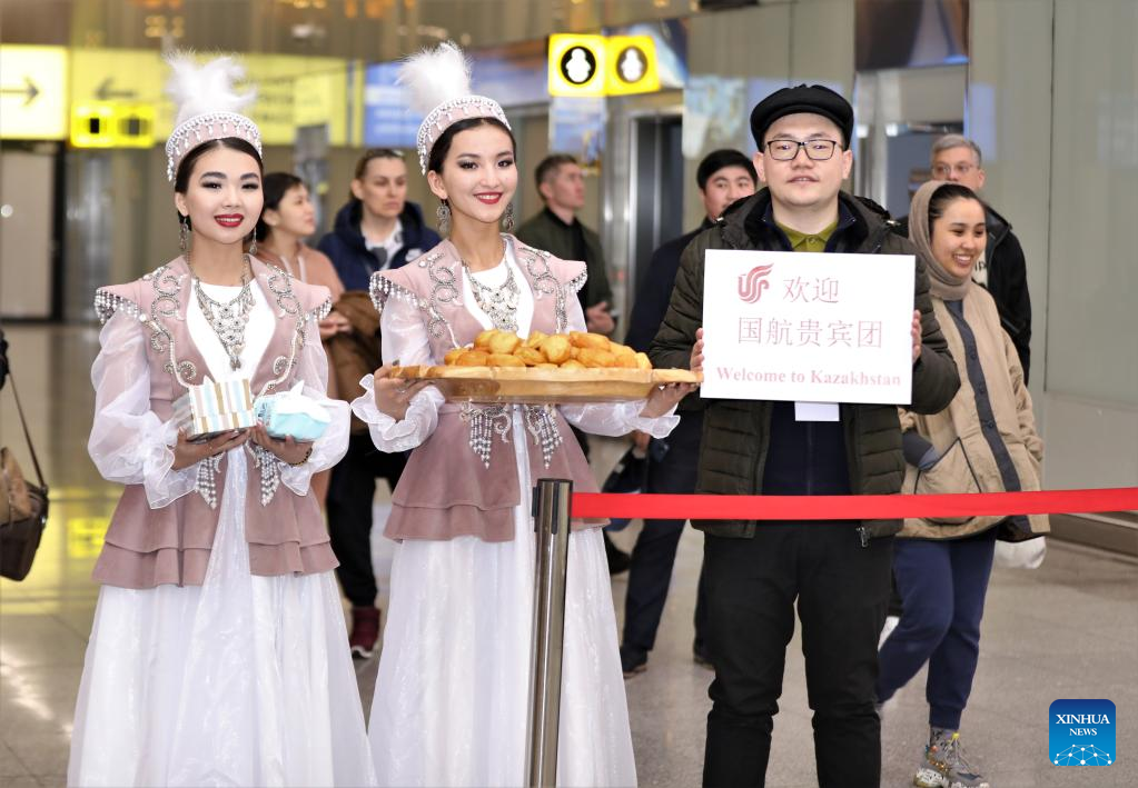 Staff members welcome passengers of the first flight on Beijing-Xi'an-Astana route at the airport in Astana, Kazakhstan, on April 21, 2023. (Photo by Kalizhan Ospanov/Xinhua)
