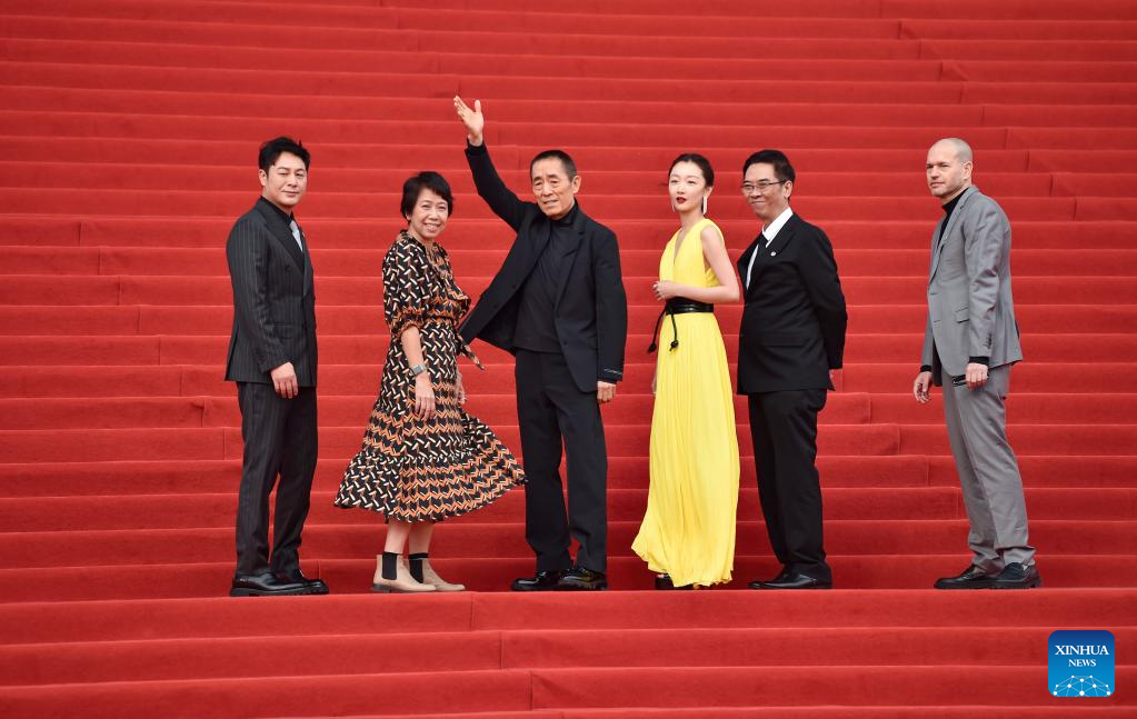 Jury members of Tiantan Awards Zhang Yimou (3rd L), Stanley Kwan (2nd R), Nadav Lapid (1st R), Pimpaka Towira (2nd L), Zhang Songwen (1st L) and Zhou Dongyu walk on the red carpet of the 13th Beijing International Film Festival in Beijing, capital of China, April 21, 2023. (Xinhua/Chen Zhonghao)