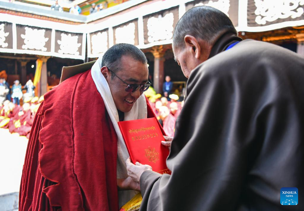 A monk receives a certificate for the degree of Geshe Lharampa in the Jokhang Temple in Lhasa, capital of southwest China's Tibet Autonomous Region, April 23, 2023. TO GO WITH:"13 monks receive doctoral degree equivalent in Tibetan Buddhism " (Xinhua/Jigme Dorje)