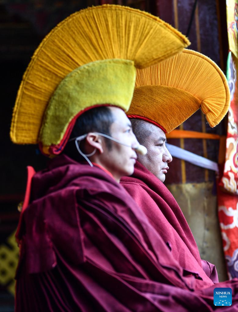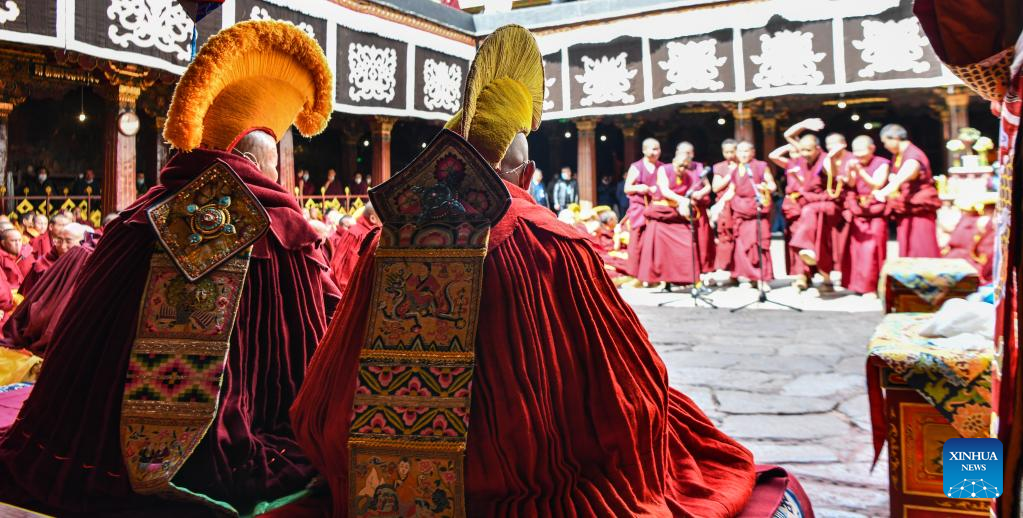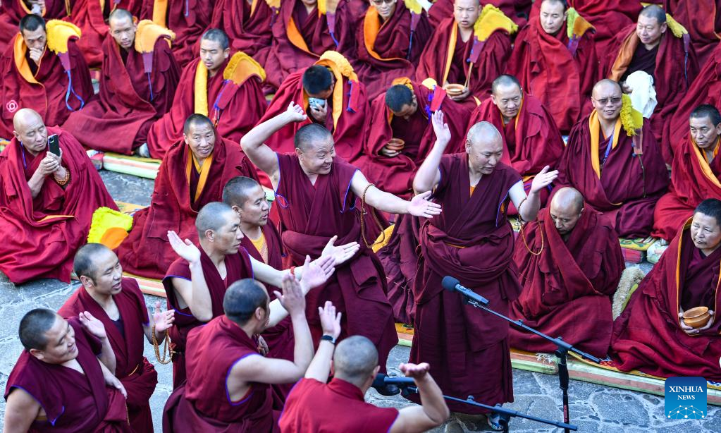 Monks attend a debate activity in the Jokhang Temple in Lhasa, capital of southwest China's Tibet Autonomous Region, April 23, 2023. TO GO WITH:"13 monks receive doctoral degree equivalent in Tibetan Buddhism " (Xinhua/Jigme Dorje)