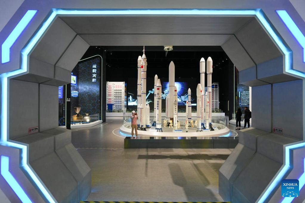 Visitors view models of the Long March series carrier rockets at the China Space Museum in Beijing, capital of China, April 24, 2023. After its renovation, the China Space Museum reopened to the public on the occasion of the Space Day of China on Monday. The museum features exhibition sections covering such themes as carrier rockets, satellites and manned spaceships, exposing visitors to the development of China's aerospace industry. (Xinhua/Ju Huanzong)