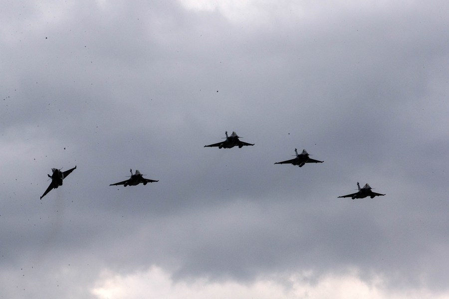 Rafale fighter jets approach the Tanagra airbase in Tanagra, Greece, on Jan. 19, 2022. (Xinhua/Marios Lolos)