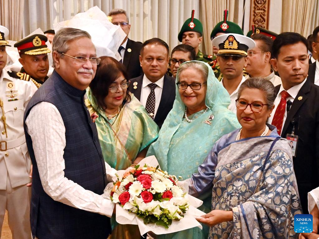 Bangladeshi President Mohammed Shahabuddin Chuppu (1st L, Front) is greeted by Bangladeshi Prime Minister Sheikh Hasina (2nd R, Front) in Dhaka, Bangladesh, on April 24, 2023. (PID/Handout via Xinhua)