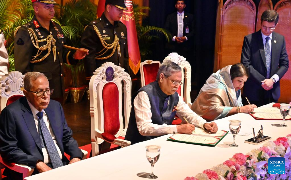 Bangladeshi President Mohammed Shahabuddin Chuppu (2nd L, Front) and Bangladeshi Parliament Speaker Shirin Sharmin Chaudhury (3rd L, Front) sign documents during the new president's oath-taking ceremony in Dhaka, Bangladesh, on April 24, 2023. (PID/Handout via Xinhua)