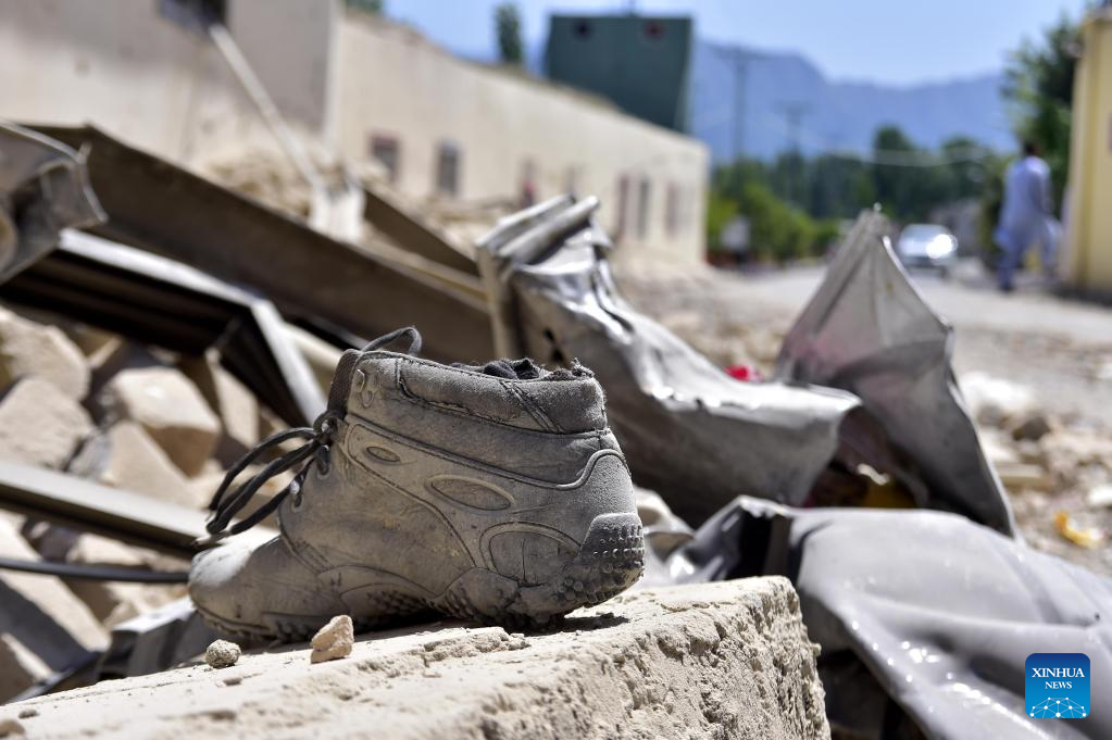 A victim's shoe is seen following twin explosions in Swat, Pakistan, on April 25, 2023. The death toll from Monday's twin explosions in a police station in Swat district of the northwestern Khyber Pakhtunkhwa (KP) province rose to 17 on Tuesday, with at least 70 others injured, health and police officials said. (Photo by Saeed Ahmad/Xinhua)