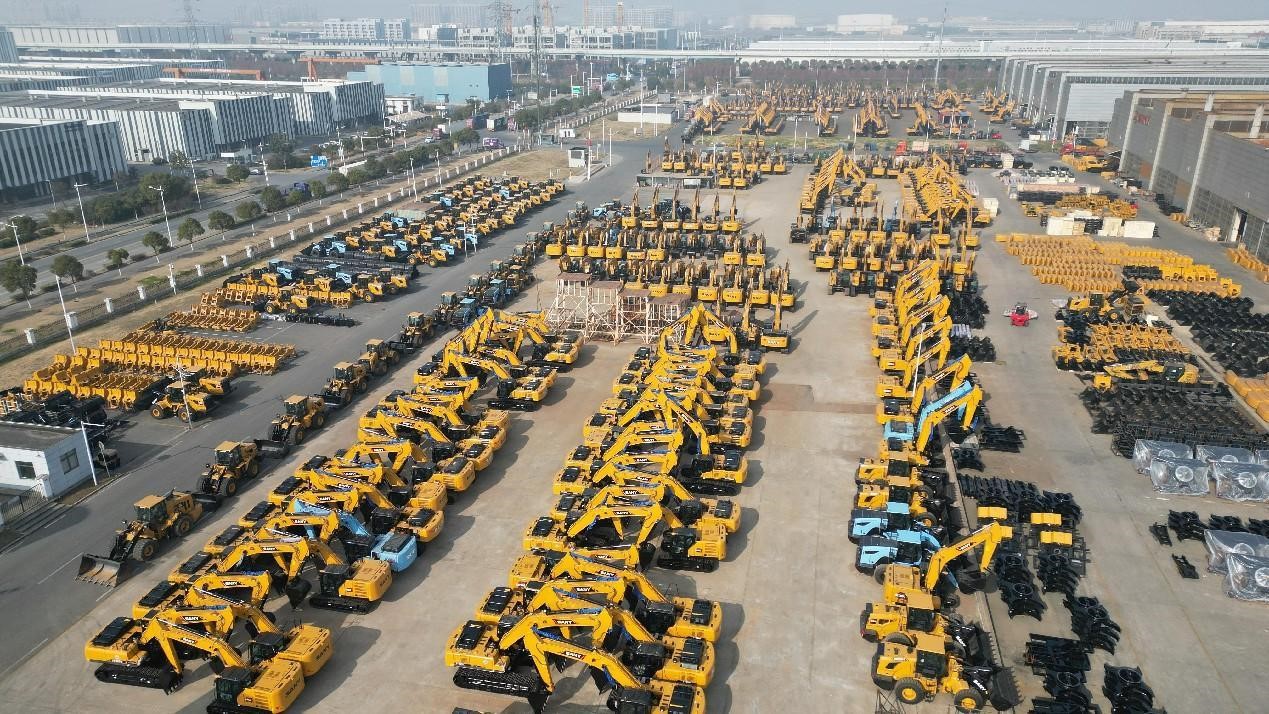 Excavators are about to be shipped overseas in a plant of Xuzhou Construction Machinery Group Co., Ltd. in east China's Jiangsu province. (People's Daily Online/Gao Gang)
