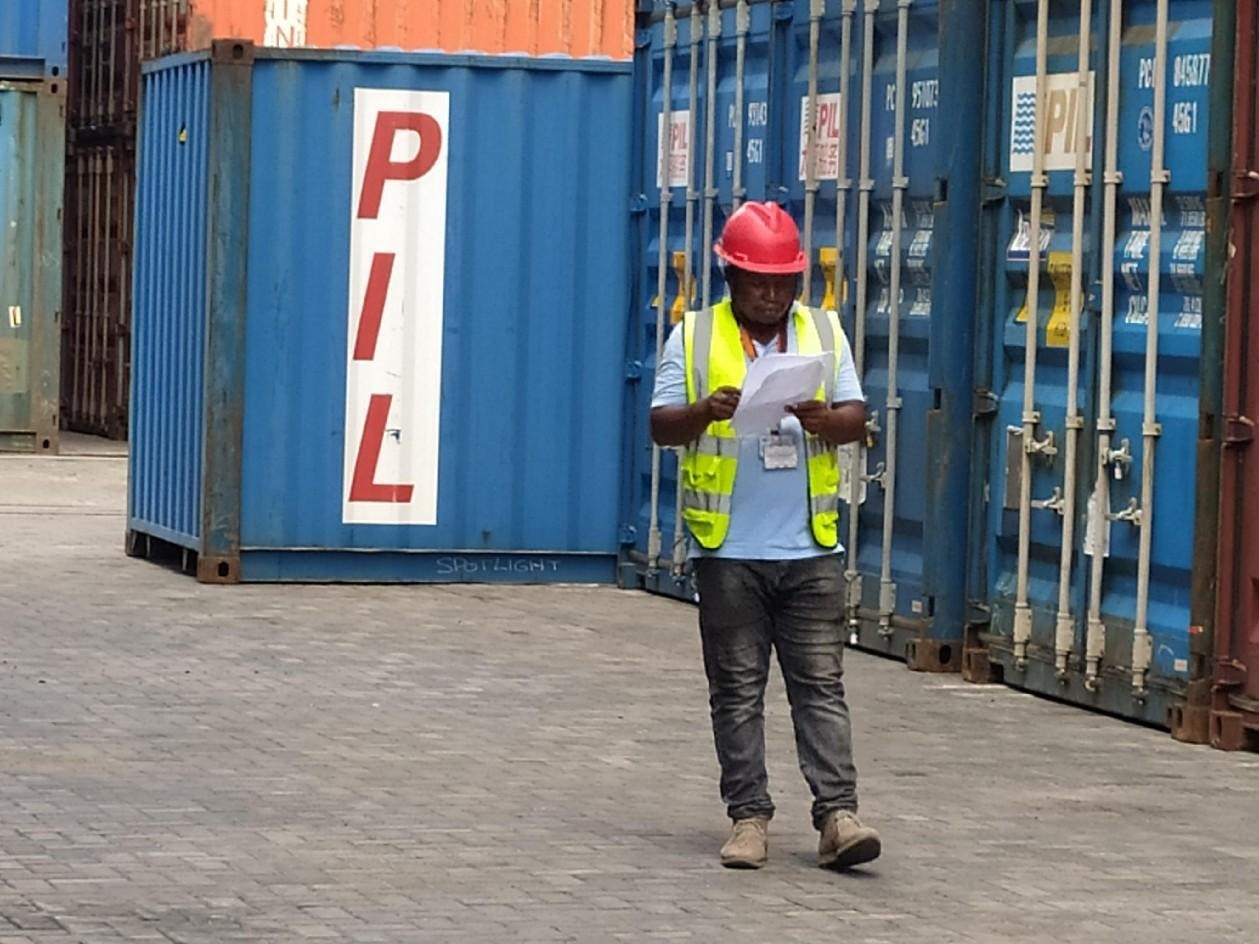 Photo shows an employee working at the Dar es Salaam Port of Tanzania. (People's Daily/Huang Peizhao)