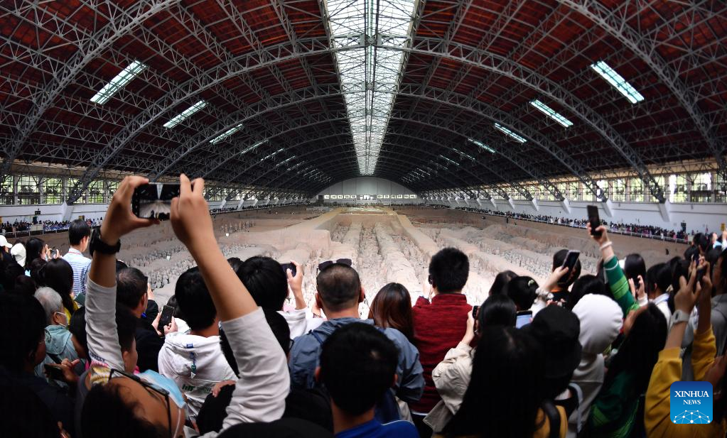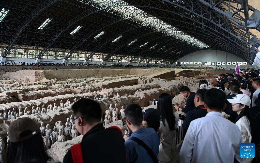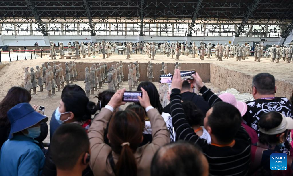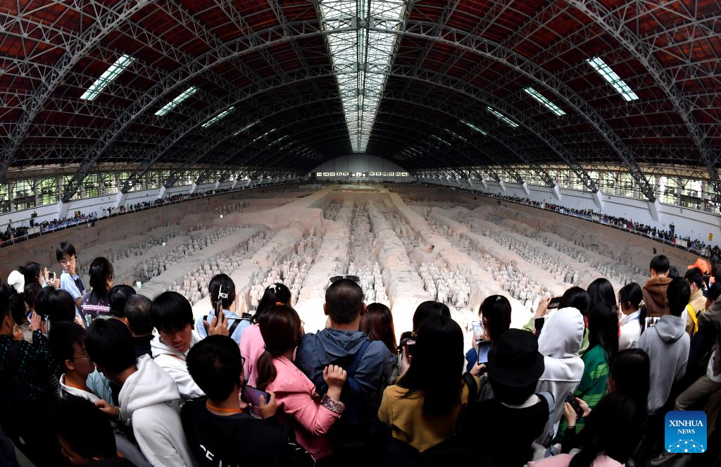People visit pit No.1 of the Emperor Qinshihuang's Mausoleum Site Museum in Xi'an, northwest China's Shaanxi Province, April 26, 2023. The Emperor Qinshihuang Mausoleum and Terracotta Warriors were included in the World Heritage list by UNESCO in 1987. (Xinhua/Liu Xiao)