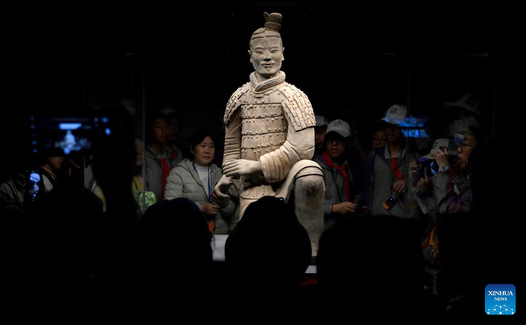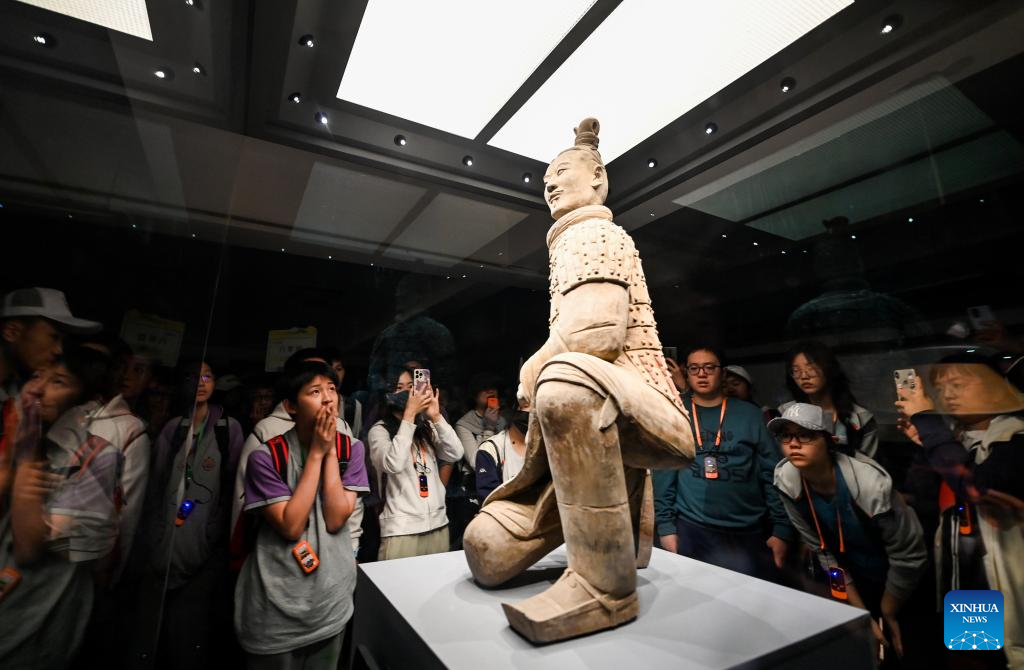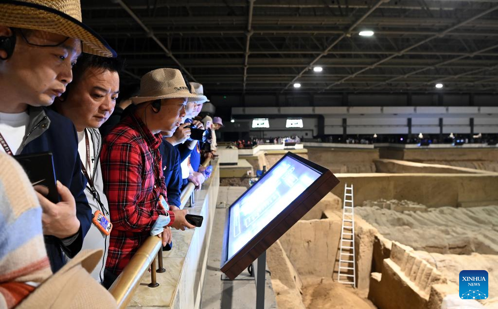 People visit pit No.3 of the Emperor Qinshihuang's Mausoleum Site Museum in Xi'an, northwest China's Shaanxi Province, April 26, 2023. The Emperor Qinshihuang Mausoleum and Terracotta Warriors were included in the World Heritage list by UNESCO in 1987. (Xinhua/Liu Xiao)