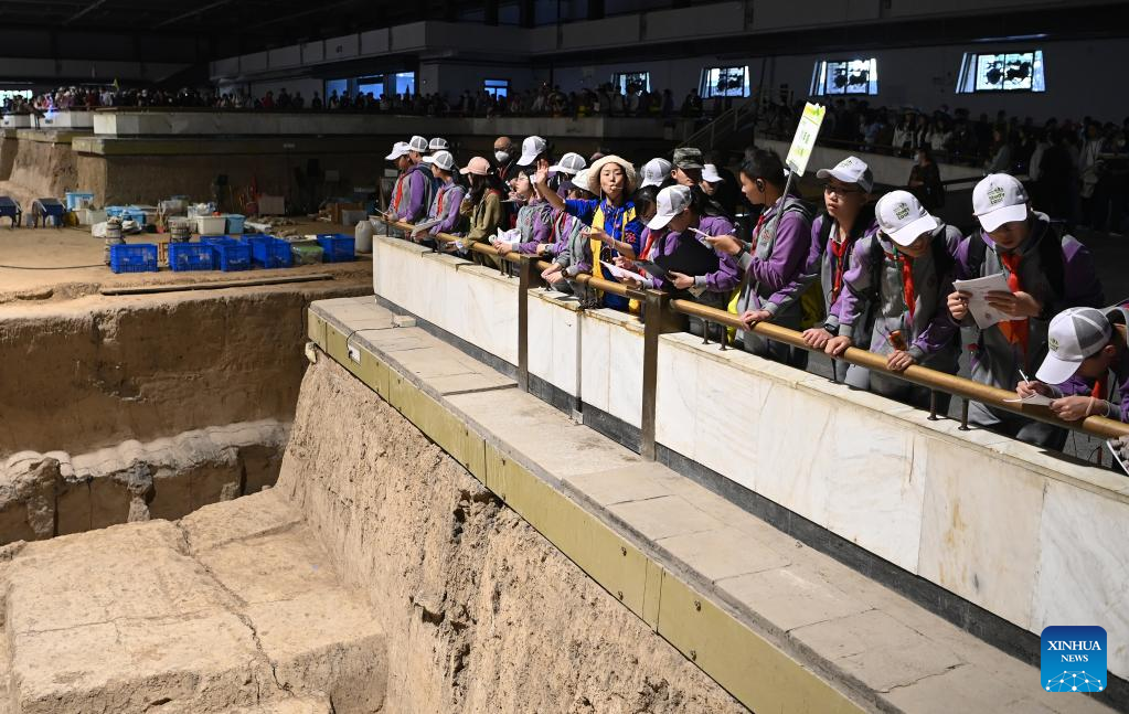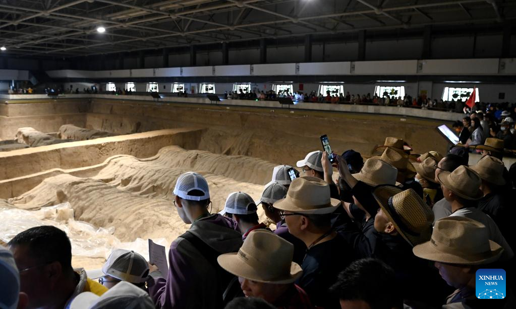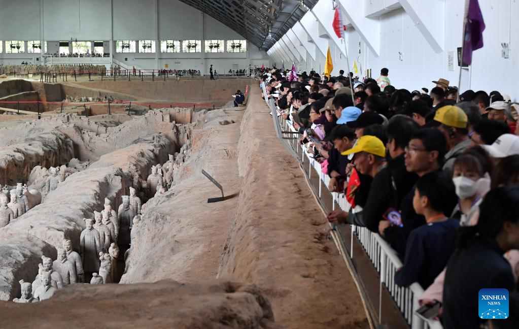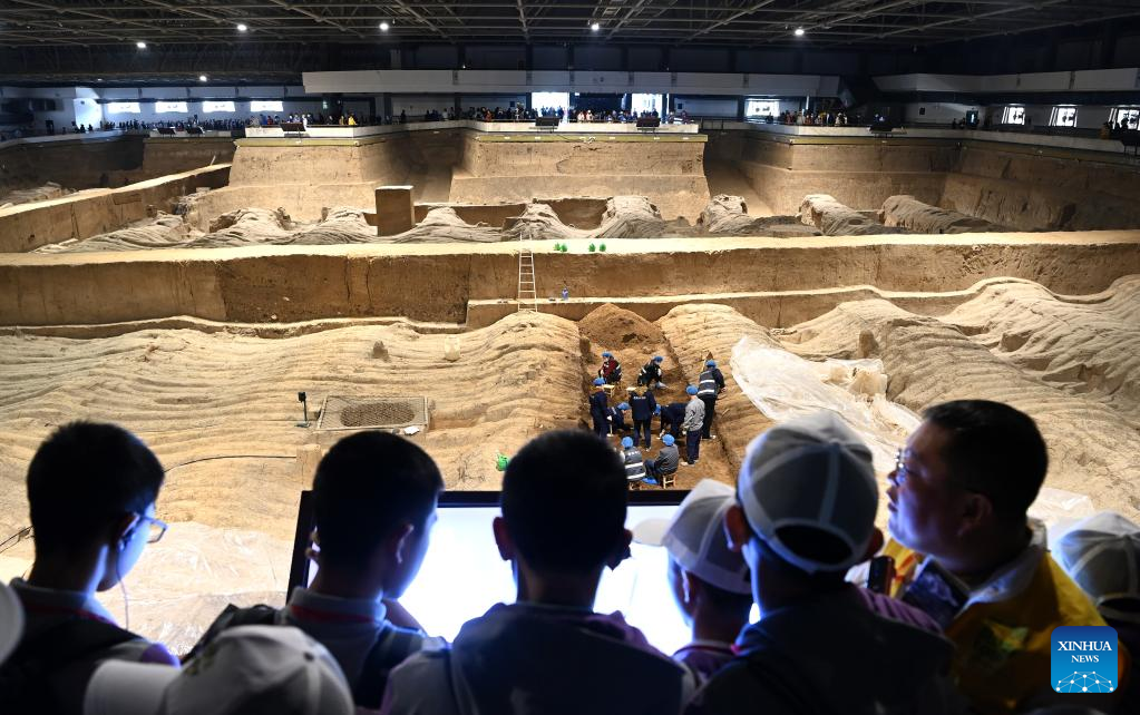 People visit pit No.2 of the Emperor Qinshihuang's Mausoleum Site Museum in Xi'an, northwest China's Shaanxi Province, April 26, 2023. The Emperor Qinshihuang Mausoleum and Terracotta Warriors were included in the World Heritage list by UNESCO in 1987. (Xinhua/Liu Xiao)
