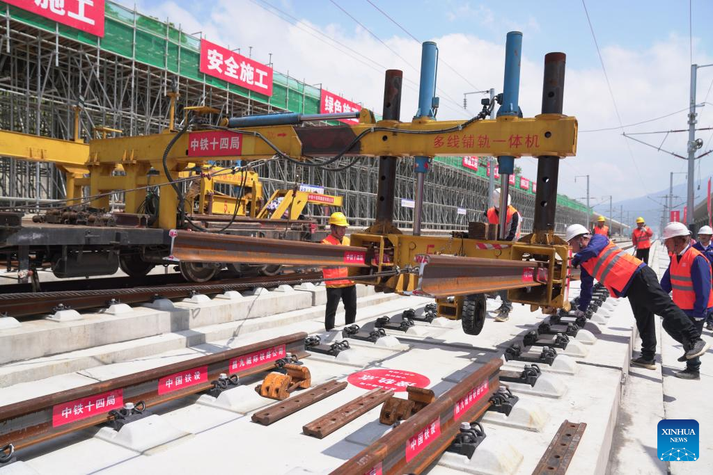 Staff members lay the track at the construction site of the Fuliang east railway station along the Nanchang-Jingdezhen-Huangshan high-speed railway in east China's Jiangxi Province, April 26, 2023. The last 500-meter-long track was laid on the Nanchang-Jingdezhen-Huangshan high-speed railway on Wednesday, marking the completion of the track-laying work for the 290-kilometer-long railway, which links Nanchang, Shangrao, Jingdezhen in Jiangxi and Huangshan in east China's Anhui. (Xinhua/Peng Zhaozhi)