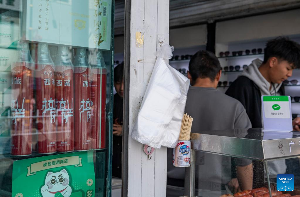 This photo taken on April 27, 2023 shows a bulging bag of snack in Lhasa, capital of southwest China's Tibet Autonomous Region. (Xinhua/Sun Fei)