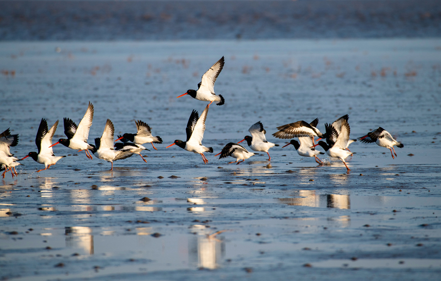 Eurasian oystercatchers rest in Tiaozini Wetland in Yancheng city, east China's Jiangsu Province. (Photo/Sun Jialu)