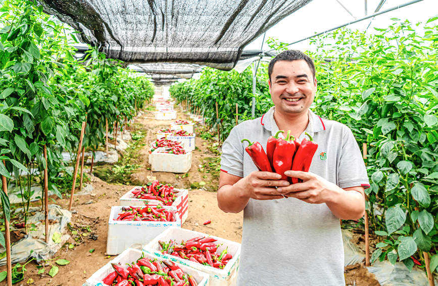 A villager displays harvested red peppers at a production base in Xicheng village, Changle town, Hepu county, south China's Guangxi Province. (Photo/Huang Tianshi)