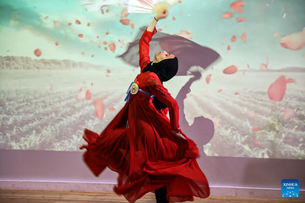 An Egyptian student performs during a Chinese Bridge language contest in Cairo, Egypt, on April 27, 2023. A qualifying round of an annual Chinese proficiency contest for foreign students concluded here in the Egyptian capital on Thursday. (Xinhua/Ahmed Gomaa)