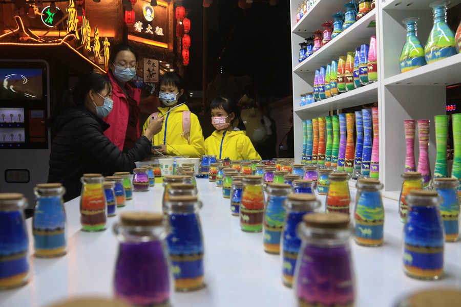 Tourists purchase sand art bottles at a night market in Dunhuang, northwest China's Gansu Province. (Photo/Zhang Xiaoliang)