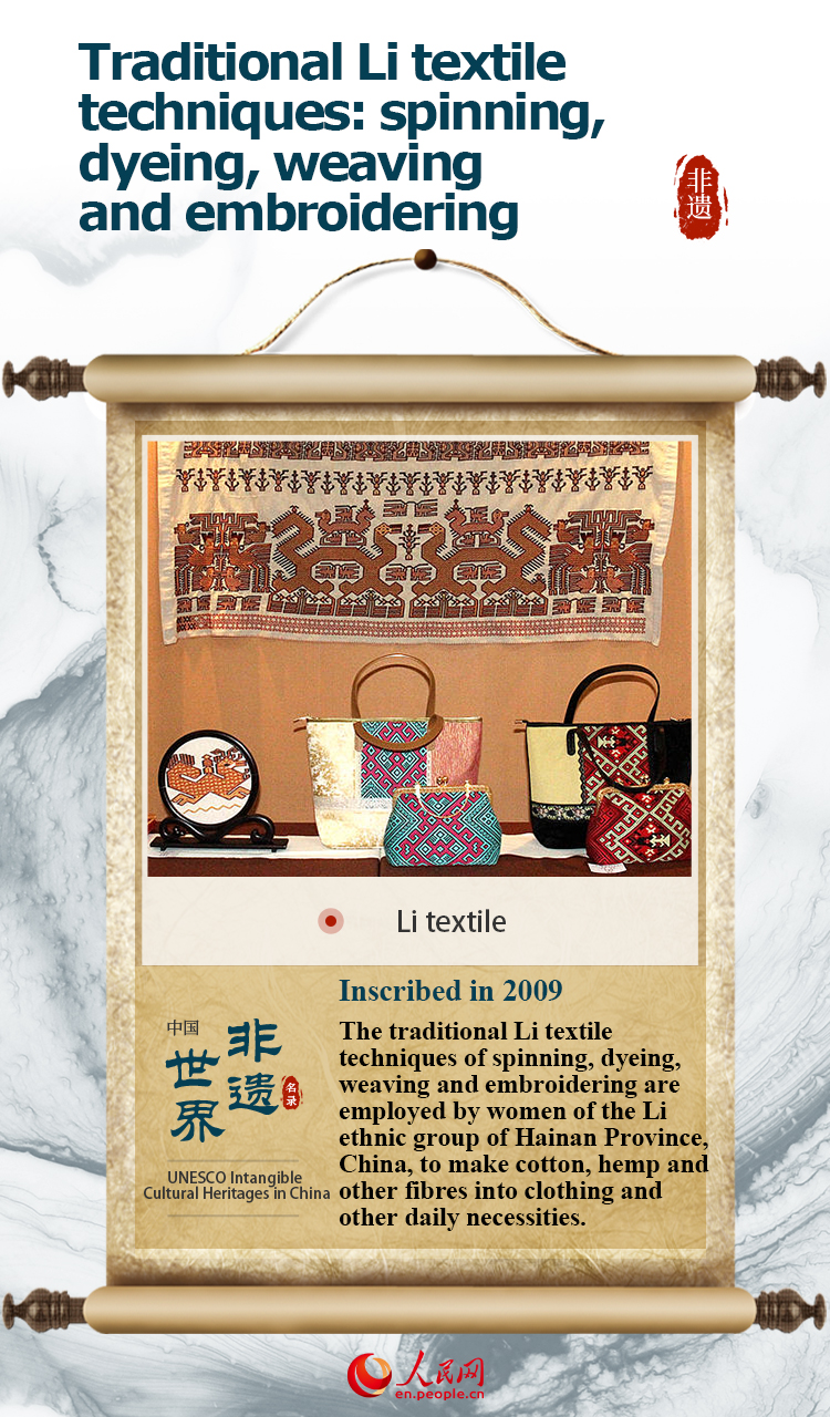 The item, "Traditional Li textile techniques: spinning, dyeing, weaving and embroidering" was inscribed on UNESCO's List of Intangible Cultural Heritage in Need of Urgent Safeguarding in 2009.