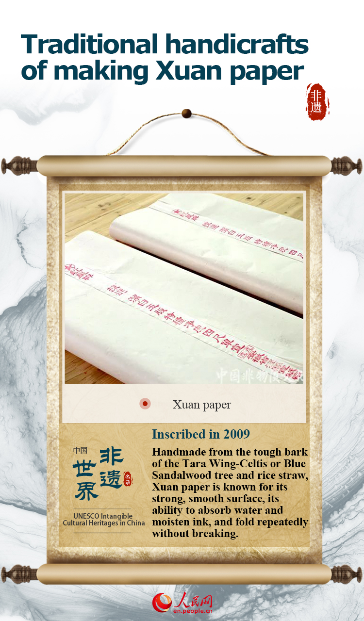 The item, "Traditional handicrafts of making Xuan paper" was inscribed on UNESCO's Representative List of the Intangible Cultural Heritage of Humanity in 2009.