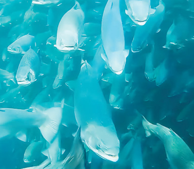Photo shows Atlantic salmons raised in the net cage at a deep-sea fish farm 120 nautical miles from the coast of the Yellow Sea of China in Qingdao, east China's Shandong Province. (Photo courtesy of Shandong Marine Group Ltd. )