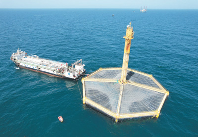 The 'Deep Blue No. 1' has a diameter of 60 meters and weighs 1,400 tonnes. The breeding space is 50,000 cubic meters. With the application of many technologies, including floating and sinking control and devices that keep sharks away from the Atlantic salmons, as well as the use of cameras and sensors, they have built an intelligent breeding control and management system, said Wu.