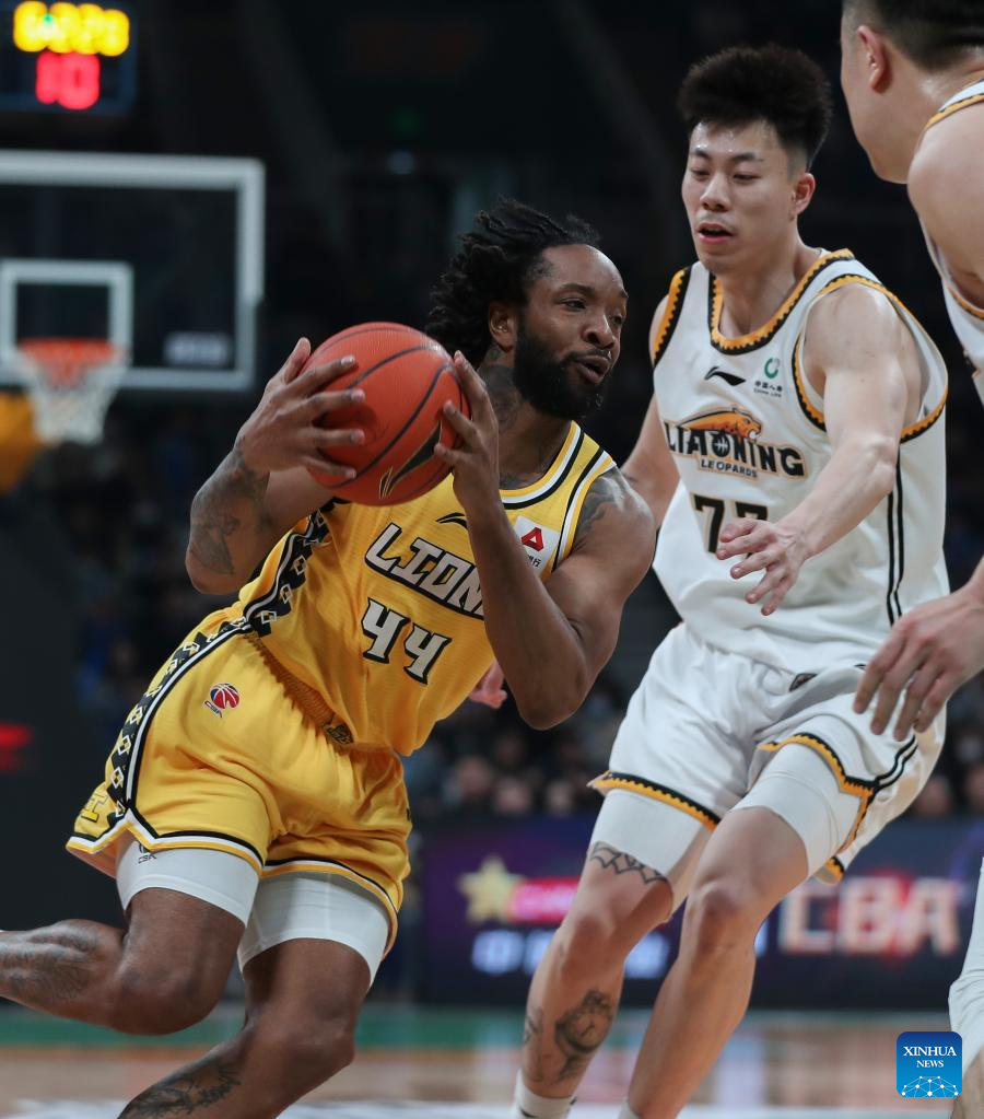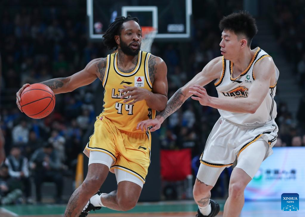 Dezmine Wells (R) of Zhejiang Lions competes during the semifinal match between Liaoning Flying Leopards and Zhejiang Lions of the Chinese Basketball Association (CBA) league 2022-2023 season playoffs, in Shenyang of northeast China's Liaoning Province, April 28, 2023. (Xinhua/Long Lei)