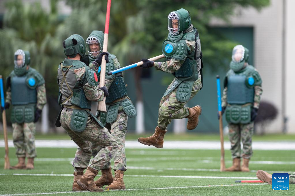 After a national flag-raising ceremony in the morning, soldiers of the garrison staged military exercises, including combatting and anti-terrorist operations, as well as theatrical performances.