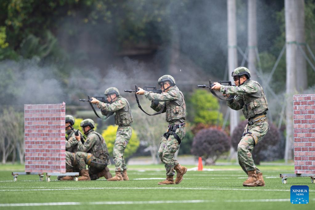 Soldiers of the Chinese People's Liberation Army Garrison stationed in the Macao Special Administrative Region stage military exercises during an open day event at the barracks on Taipa Island in Macao, south China, April 30, 2023. This was the 17th time that the barracks had been opened to the public since 2005, helping with communication between the garrison and local residents. (Xinhua/Cheong Kam Ka)
