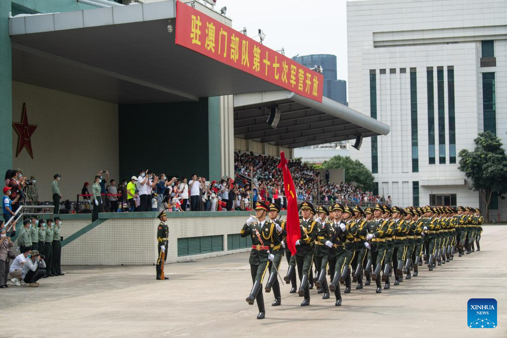 Soldiers of the Chinese People's Liberation Army Garrison stationed in the Macao Special Administrative Region attend a national flag-raising ceremony during an open day event at the barracks on Taipa Island in Macao, south China, April 30, 2023. This was the 17th time that the barracks had been opened to the public since 2005, helping with communication between the garrison and local residents. (Xinhua/Cheong Kam Ka)