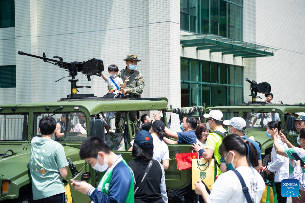 Citizens attend an open day event at the barracks of Chinese People's Liberation Army Garrison stationed in the Macao Special Administrative Region on Taipa Island in Macao, south China, April 30, 2023. This was the 17th time that the barracks had been opened to the public since 2005, helping with communication between the garrison and local residents. (Xinhua/Cheong Kam Ka)