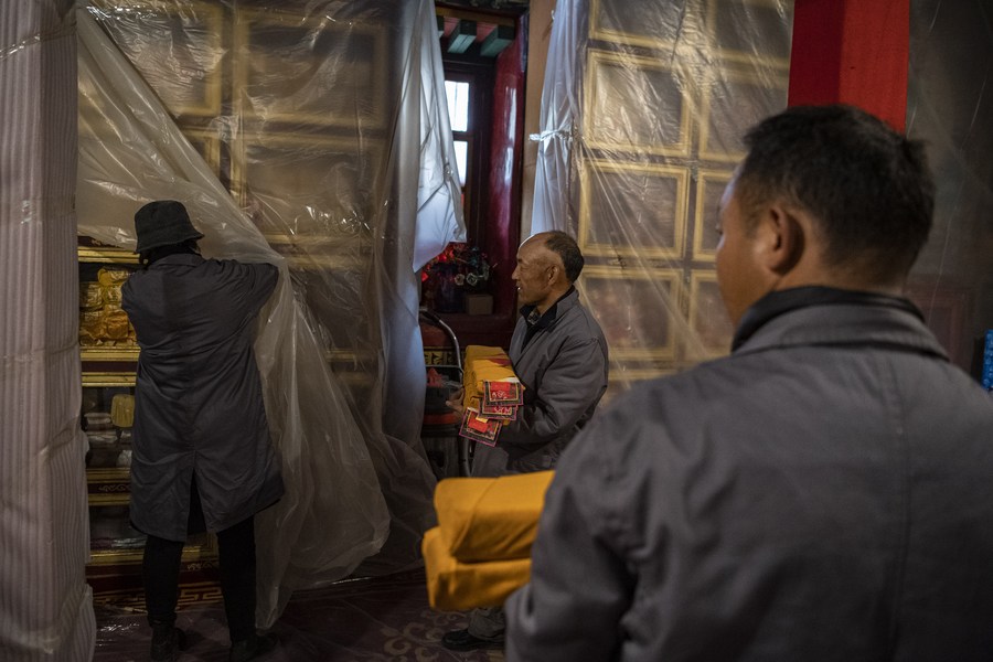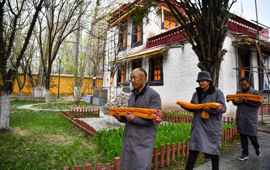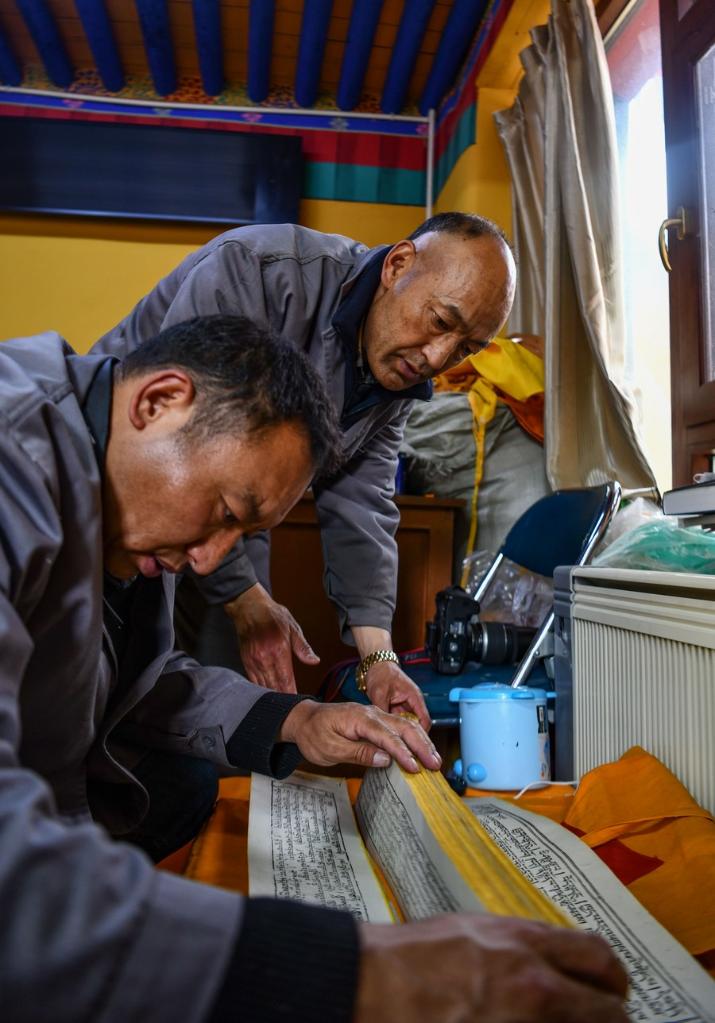 LHASA, April 30 (Xinhua) -- At Truzing Palace of Norbulingka in the western suburbs of Lhasa, thousands of ancient books on various fields of Tibet are stored on shelves. For now, Gyumey Tsultrim and his colleagues' primary task is to make an inventory of the ancient books both manually and digitally.