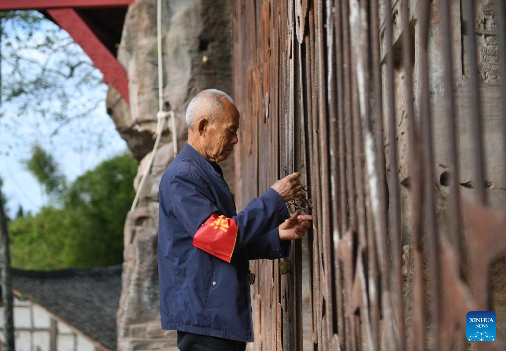 Wu Zhongfu patrols the Wofo Yard in Anyue County, southwest China's Sichuan Province, April 3, 2023. Wu Zhongfu, 73-year-old, has been protecting and conserving the Buddhist statues and stone carvings of Buddhist scriptures from Tang Dynasty (618-907) for 41 years in the Wofo (meaning sleeping Buddha) Yard of Anyue County in Sichuan Province.
