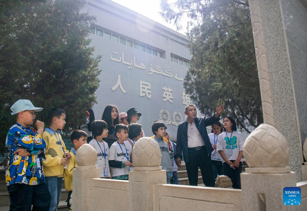 Eniwar Emer (3rd R) tells stories about the martyrs to the visitors in the Yecheng Martyrs Cemetery in Yecheng, northwest China's Xinjiang Uygur Autonomous Region, April 16, 2023.