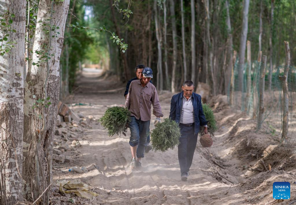 Eniwar Emer (R) carries tree seedlings to the Yecheng Martyrs Cemetery in Yecheng, northwest China's Xinjiang Uygur Autonomous Region, April 16, 2023.