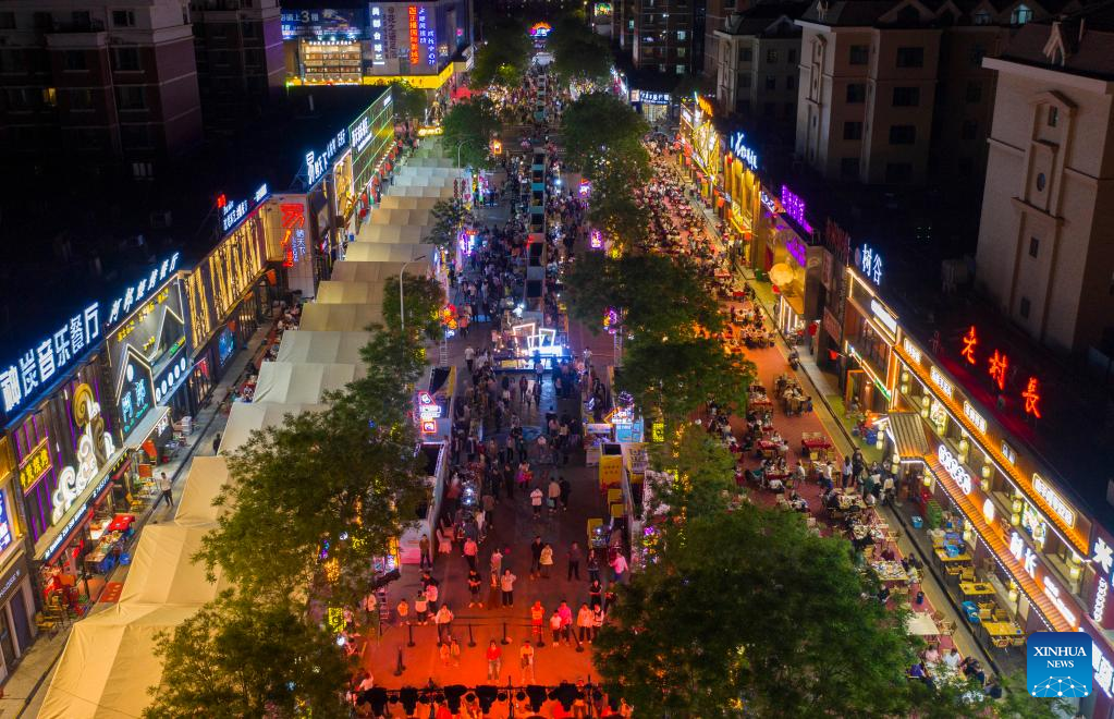 This aerial photo taken on May 2, 2023 shows Jingde night market in Xingqing District of Yinchuan, northwest China's Ningxia Hui Autonomous Region. Yinchuan has been making efforts to bolster its nighttime economy in recent years. (Xinhua/Yang Zhisen)