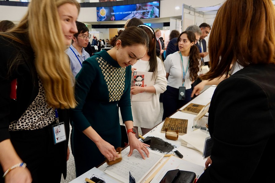 Visitors experience the traditional Chinese art of rubbing at the UN Chinese Language Day event in Vienna, Austria, May 2, 2023. (Photo by Wang Zhou/Xinhua)