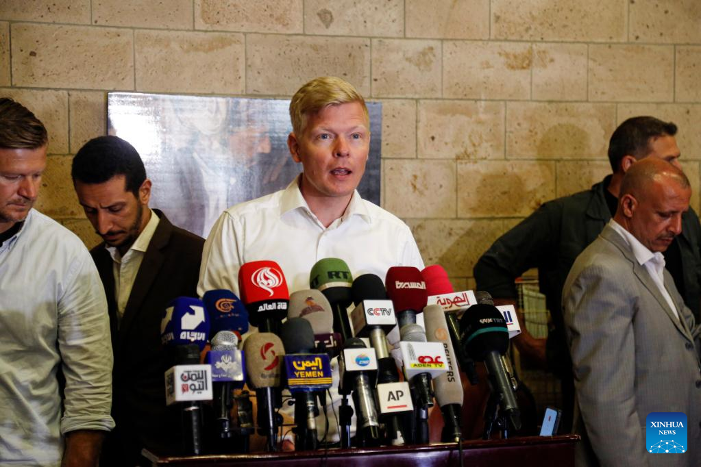 The United Nations (UN) Special Envoy for Yemen Hans Grundberg (C) attends a press conference in Sanaa, Yemen, on May 3, 2023. The United Nations (UN) Special Envoy for Yemen Hans Grundberg announced on Wednesday that he had "positive engagements" with Houthi authorities in Sanaa, calling on concerning parties to take bold steps to end the years-long war in the country. (Photo by Mohammed Mohammed/Xinhua)