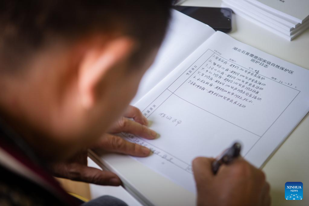 Ranger Liu Jigao fills patrol log at Shishou Milu Deer National Nature Reserve in central China's Hubei Province, April 29, 2023. (Xinhua/Wu Zhizun)