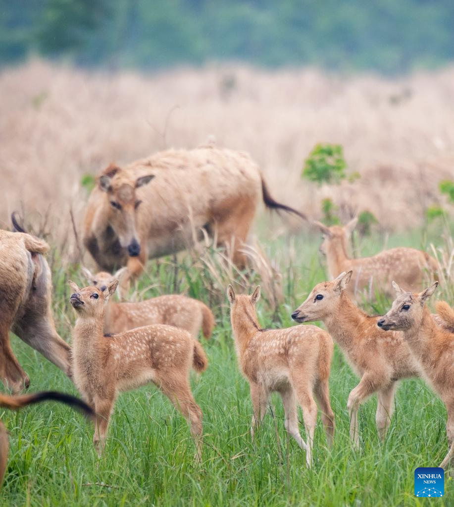 This photo taken on April 28, 2023 shows milu deer at Shishou Milu Deer National Nature Reserve in central China's Hubei Province. (Xinhua/Wu Zhizun)