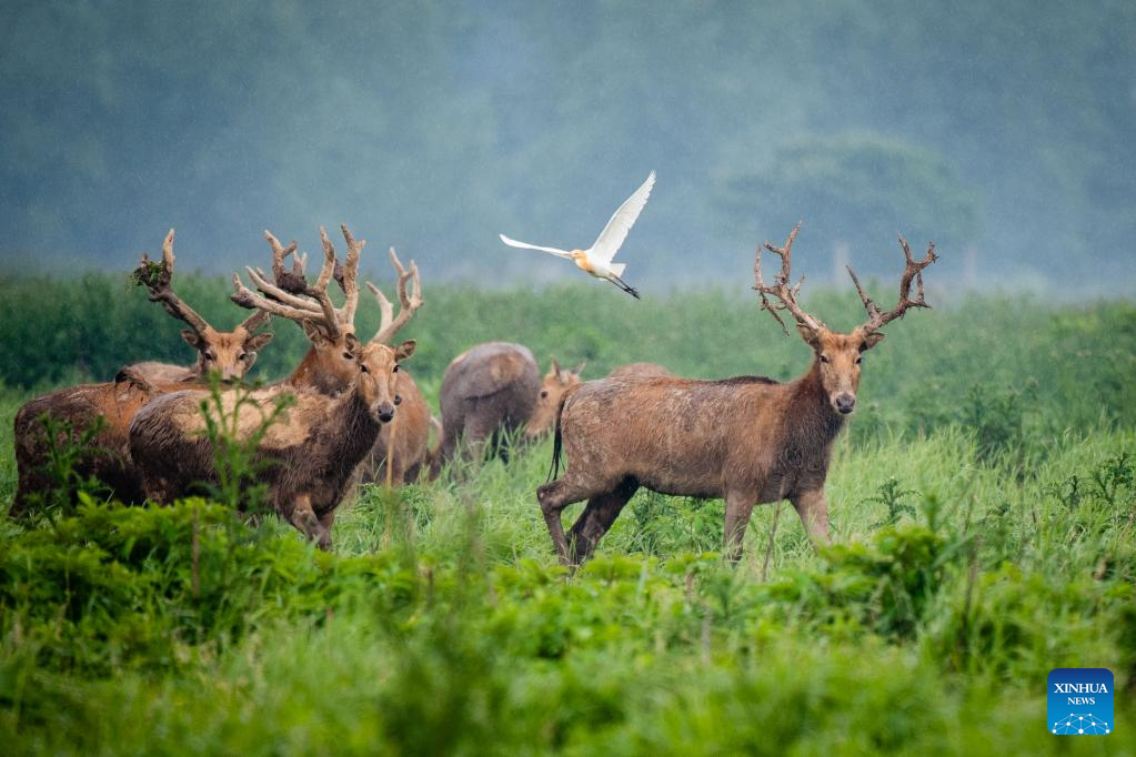This photo taken on April 28, 2023 shows milu deer and birds at Shishou Milu Deer National Nature Reserve in central China's Hubei Province. (Xinhua/Wu Zhizun)