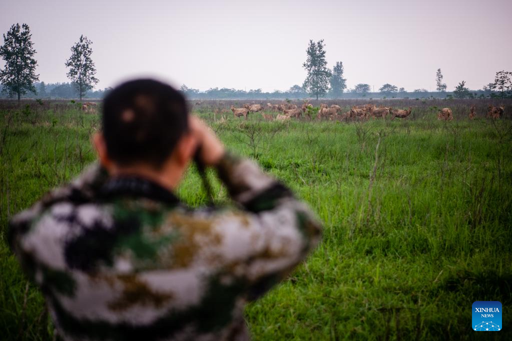 Ranger Liu Jigao observes milu deer at Shishou Milu Deer National Nature Reserve in central China's Hubei Province, April 28, 2023. (Xinhua/Wu Zhizun)